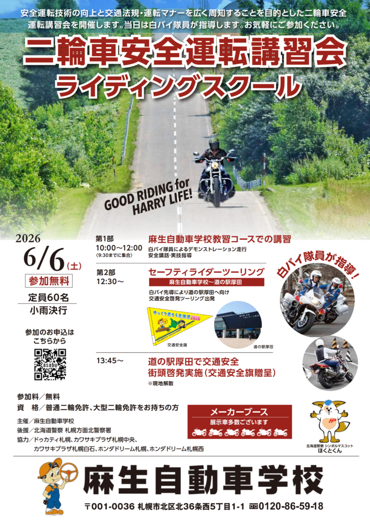 午前は白バイ隊員による安全運転講話と講習、午後からは白バイ隊先導による安全運転啓発ツーリングを行います。詳細は下記のポスターをご覧下さい。